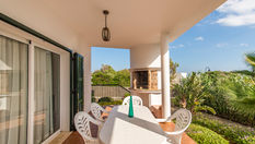 Desde la terraza cubierta de la villa se accede, por un lado, a la terraza de la casa con vistas al mar y, por el otro, a la zona de la piscina. Los jardines están bien cuidados y son de estilo menorquín, con flores y plantas autóctonas sobre una base de grava.